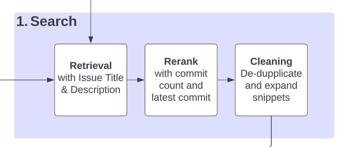 The next step is to use the codebase, but codebases can have up to thousands of files! Thus, we only search for relevant files.